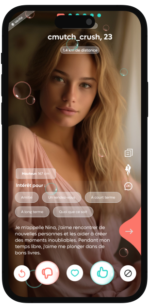 Peut-être as-tu eu l’impression par le passé que les rencontres numériques n’étaient tout simplement pas pour toi. Mais BeMee n’est pas une application de plus – c’est un espace sûr, créé en pensant à ton besoin d’authenticité. Pour t’aider à trouver la bonne personne plus facilement et plus rapidement, nous avons développé des outils qui vont au-delà des apparences. Chez nous, ton profil prend vie : au lieu d’une simple photo, tu peux ajouter une vidéo de profil qui révèle ton vrai visage, ta voix et ton énergie. Et pour éclairer ton chemin, laisse-toi guider par la Connexion Cosmique – une énergie spéciale qui, à travers les influences stellaires et les affinités astrologiques, révèle un lien profond et du destin entre deux personnes.